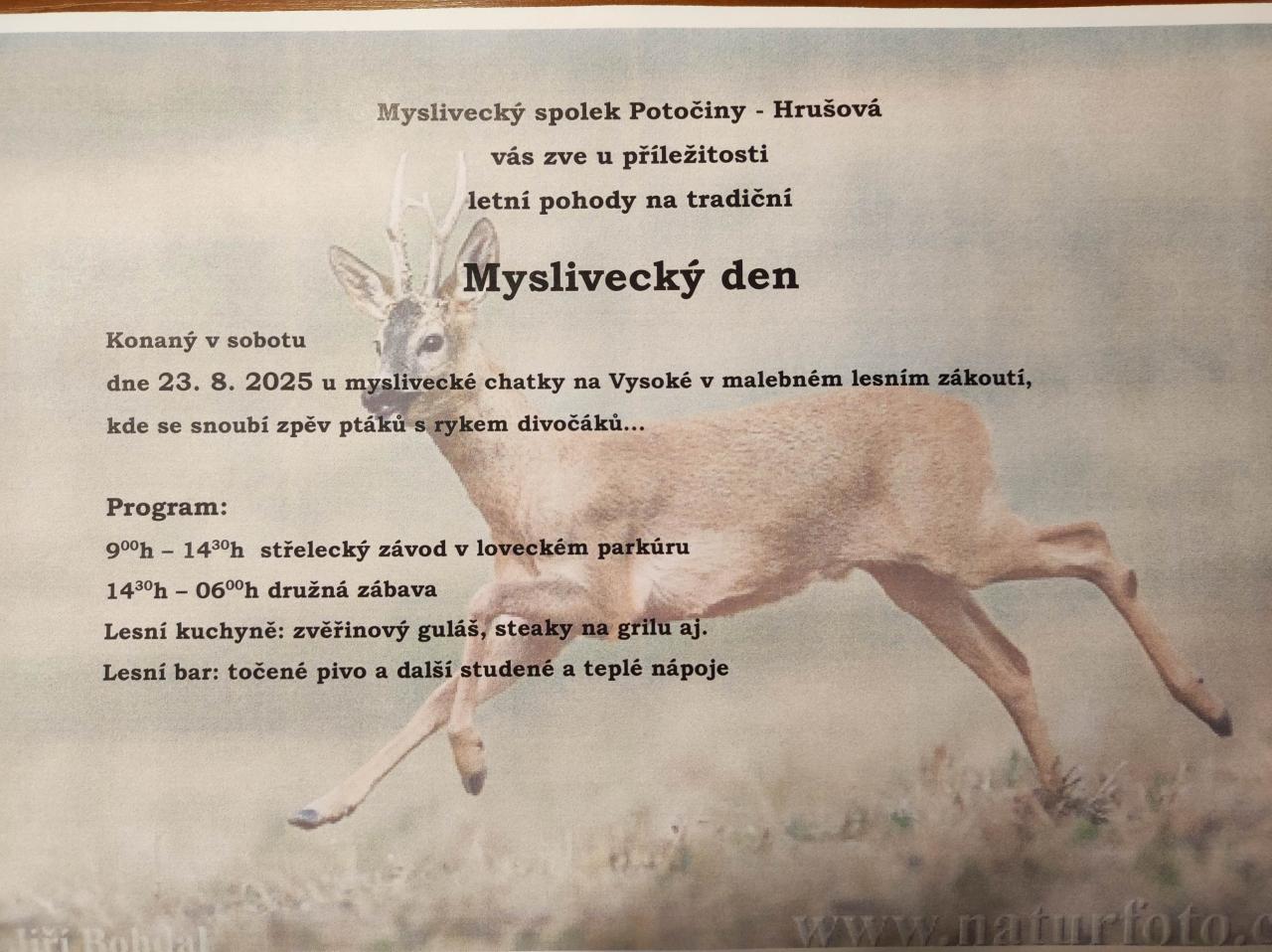 Myslivecký spolek Potočiny pořádá tradiční Myslivecký den, který se bude konat na Vysoké dne 28.3.2025. Návštěvníci se mohou těšit na výborné pokrmy z lesní kuchyně, jako je zvěřinový guláš, a osvěžující nápoje v lesním baru, kde bude k dispozici točené pivo a další studené nápoje. Těšíme se na Vaši návštěvu a podporu.
